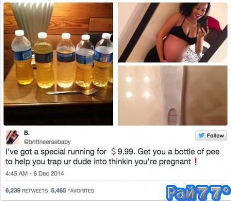 "У меня есть для вас специальное предложение... Вы покупаете у меня мочу и обманываете или разыгрываете своего молодого человека, чтобы он поверил в вашу беременность," - написала беременная "предпринимательница" на своей странице в "твиттере" и в качестве доказательств опубликовала фотографии непосредственно с товаром и изображения своей персоны в интересном положении. Но за сутки "лот" собрал большое количество негативных комментариев в основном от представителей мужского пола, что несостоявшаяся "бизнесвуме