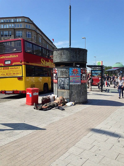 А этот бомж загорает у вокзала. Их, кстати, здесь много