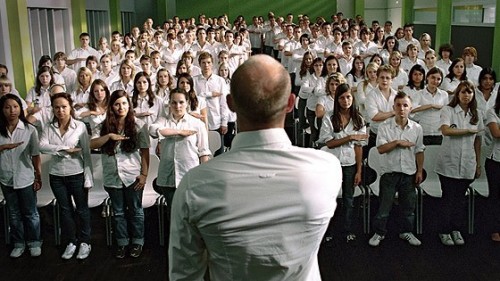 Во вторник мистер Джонсон вошел в класс еще до начала урока, но к своему удивлению обнаружил, что дети уже на своих местах и сидят смирно. Тему занятия он написал на доске – «общность». Рон поведал о силе общности и сказал детям слоган «Третьей Волны»: «Сила в дисциплине, сила в общности». Поначалу ученики проговаривали эти слова шепотом, потом стали говорить вслух, затем перешли на повышенные тона, и в конце концов, скандировали очень громко. Завершая очередной урок, учитель продемонстрировал особый жест «Салют Третьей Волны» и сказал, что с этого момента все дети должны приветствовать друг друга только таким образом.